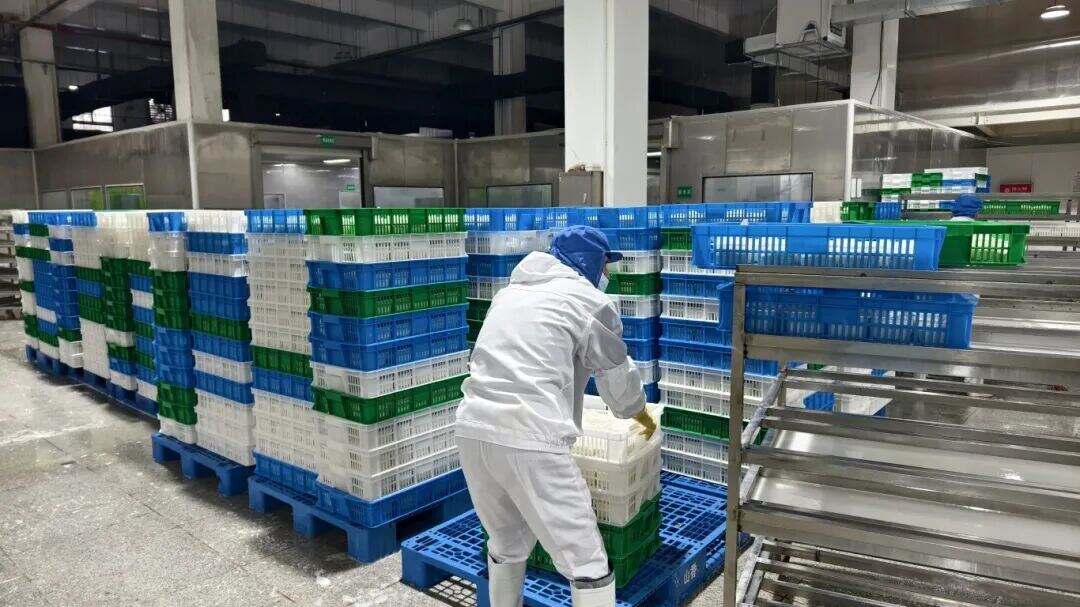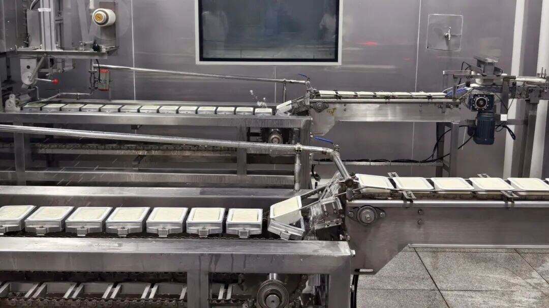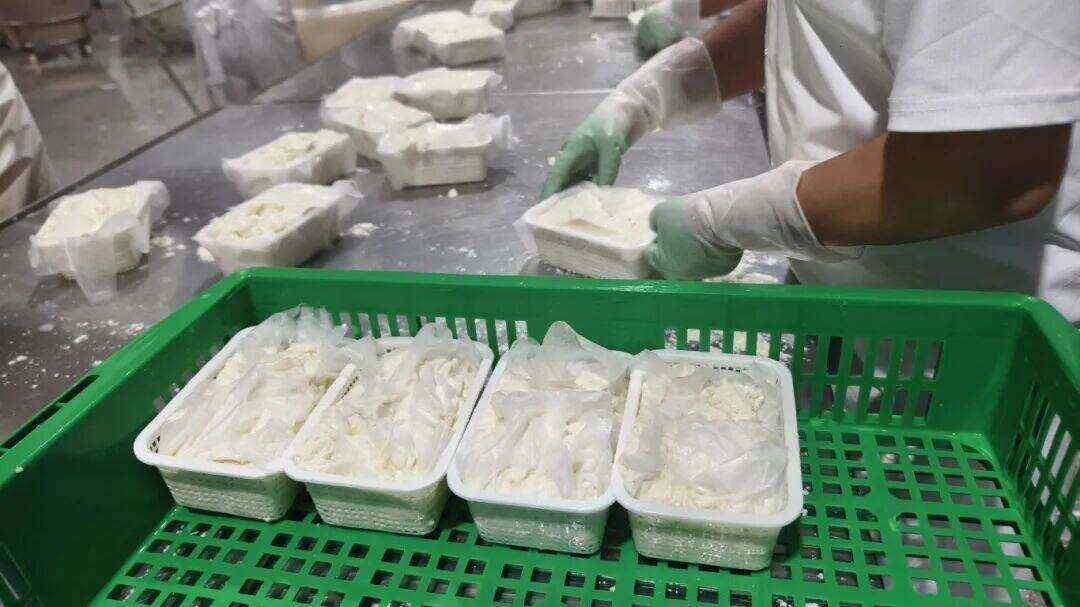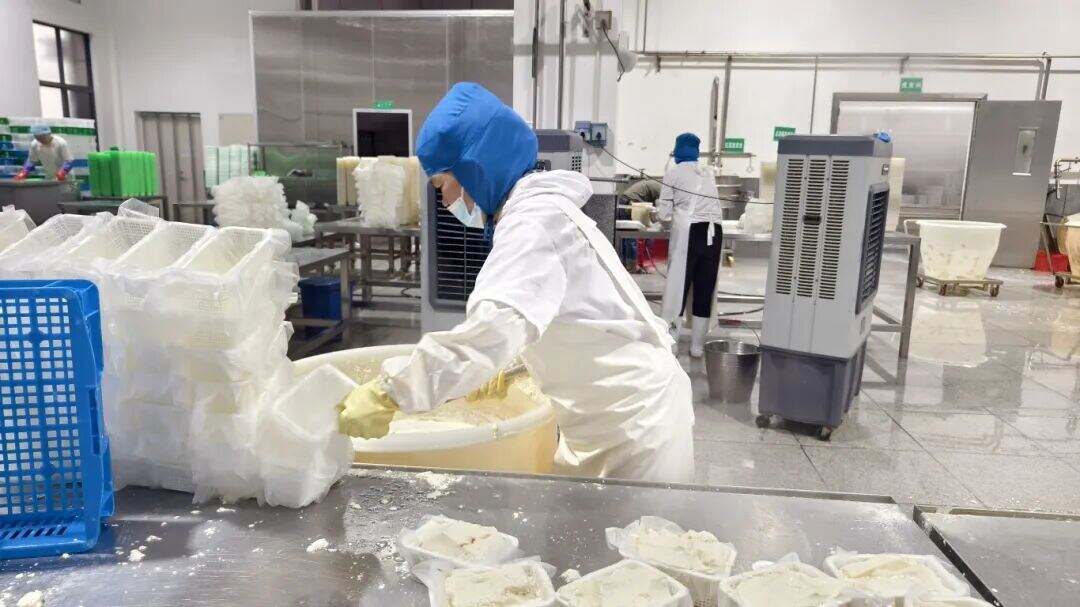 车间内,订单的热度转化为出产的干劲。操作台前,工人们默契协作、动作熟练:一侧工人手持柄勺,将刚凝聚成型的卤水豆腐稳稳舀进铺好无纺布的小箩筐中;另一侧工人接过小箩筐,拉起纱布四角层层包裹,码放到专用沥水架上,静待豆腐沥干水分。车间另一端,主动化打包出产线高速作业,沥干后的豆腐经传送带精准输送至包装工位,历经主动覆膜、封盒、贴标等工序,及时发往各地商场。