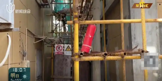 脚手架与旁边的居民楼距离不到一米,期间没有施工铭牌,也无人值守,甚至脚手架部分区域已经生锈,配电间的玻璃门碎裂,大门随便一推就能进。“消防隐患大得很!”居民直言担心。