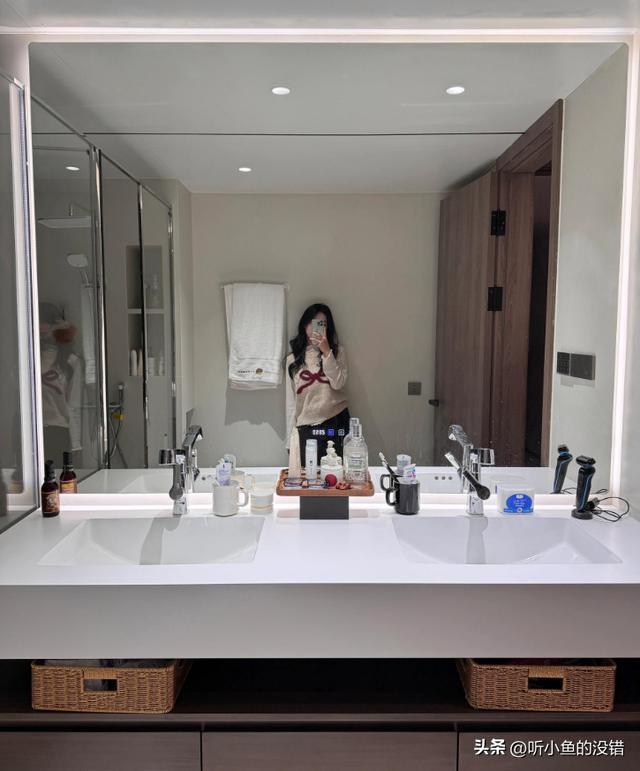 水电师傅本来想把镜前灯装在镜子上方,说这是常规操作,媳妇非要改到镜子两侧,当时我还觉得没必要。