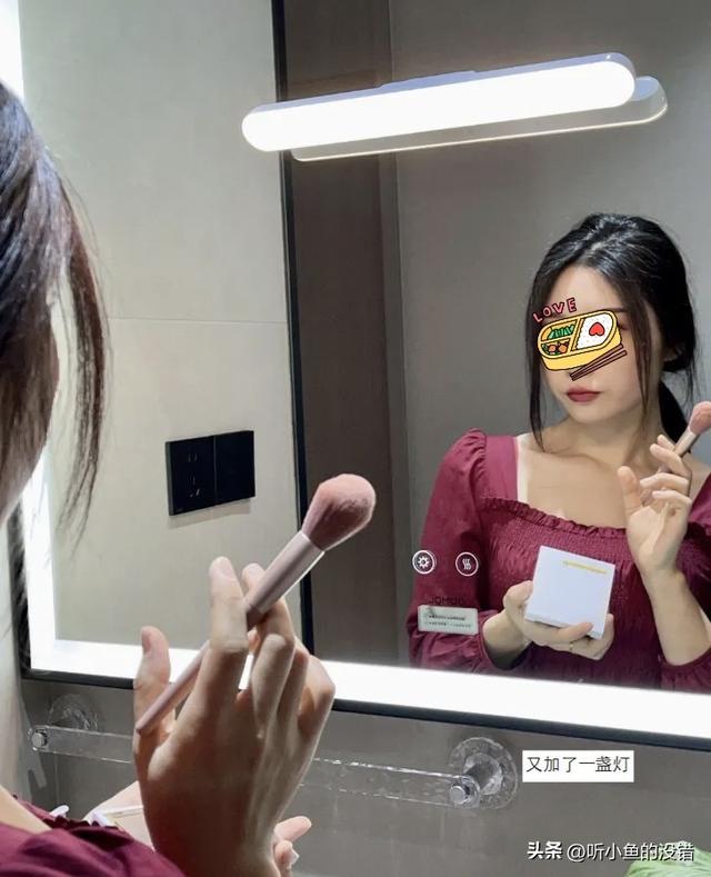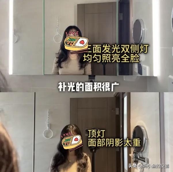 实际用起来才知道差别多大,只装顶部灯光,洗漱、化妆时脸上全是阴影,看不清细节,画眼线、刮胡子总出错。