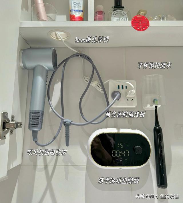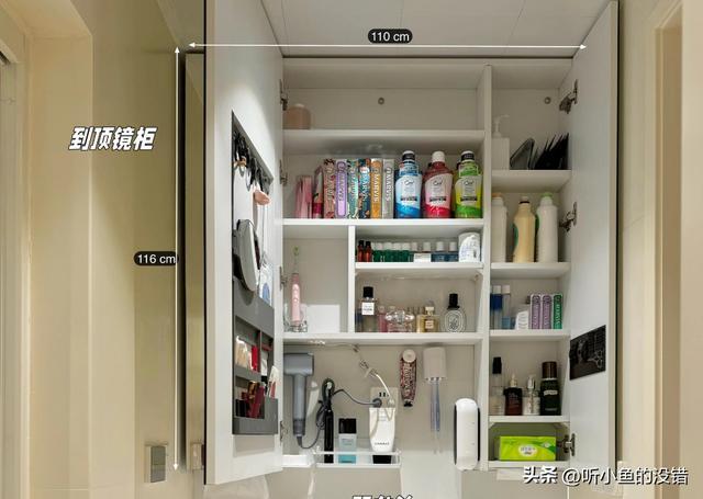镜柜设计得特别贴心,内部隔层分得多,还能灵活调整高度,大瓶洗发水、小支洗面奶都能找到位置;特意留了一块没底板没背板的区域,牙刷、洗手液机、吹风机直接放进去,不用反复插拔电源,用完沥干水分还不容易发霉;