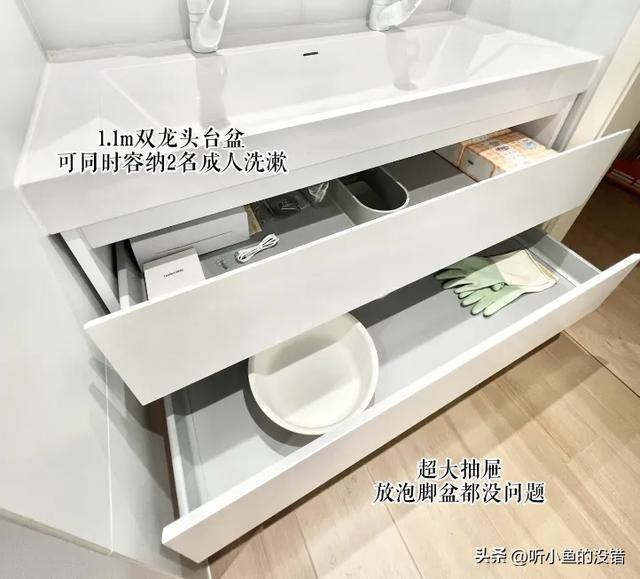 传统浴室柜都是双开门,内部空荡荡没层板,东西放进去乱糟糟,找的时候得蹲下来翻半天,特别麻烦。媳妇直接改成了抽屉设计,用着顺手多了,收纳能力也比双开门强不少。