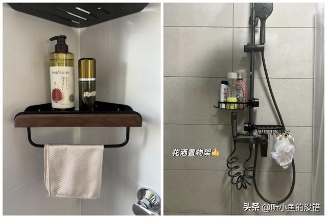 最后我们在墙面装了简易沥水收纳架,花洒也选了自带置物架的款式,洗发水、沐浴露直接放置在上面,通风透气不积水,用完擦一擦就能保持干净,不用费心打理。