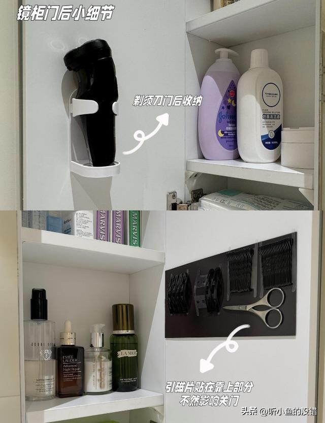 左右两侧底部开了孔,专门放卷纸,不怕洗澡时溅到水,拿取也方便;柜门背面贴了磁吸贴、挂了网袋,皮筋、化妆棉这些小零碎都能收纳,一点空间不浪费。