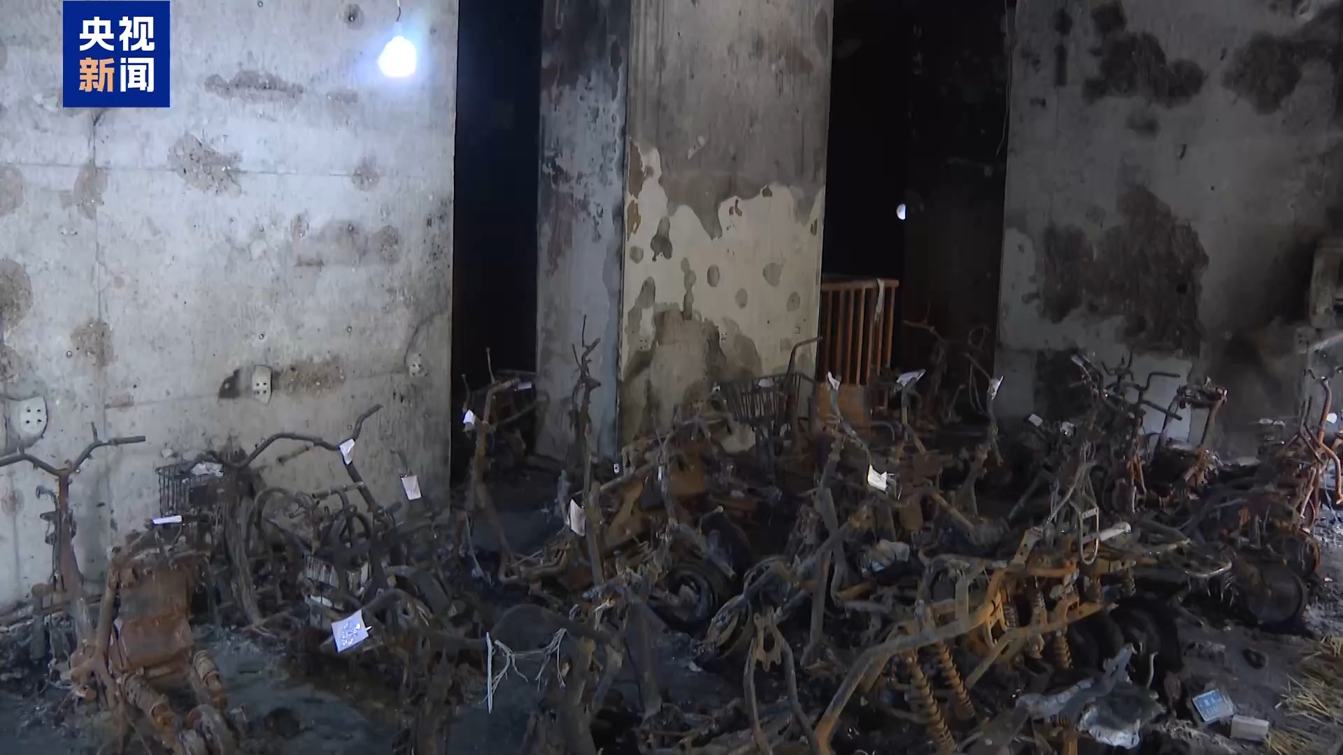 记者在事发现场看到,起火住宅楼多户居民外窗均有烟熏痕迹,一层与门厅相连的架空层全部过火,多处墙皮被高温烘烤脱落,停放在架空层的电瓶车全部被烧得只剩下车架子和轮毂,用于住户采光通风的天井也被烟熏火燎过。